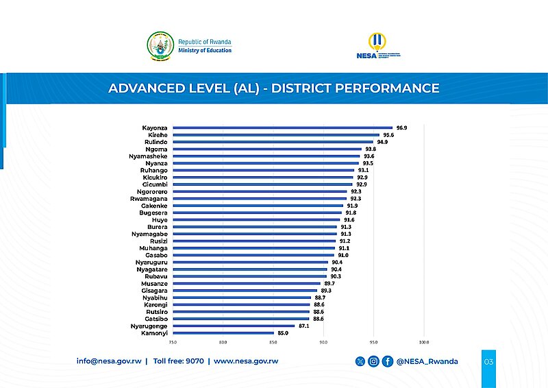 Akarere kaje ku mwanya wa kabiri, aho abanyeshuri bashoje icyiciro cy'amashuri yisumbuye bakoze ibizamini batsinze ku gipimo cya 95.6%.